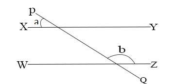 চিত্রে XY এবং WZ দুটো সমান্তরাল সরলরেখা, PQ তাদের ছেদক। সে ক্ষেত্রে <math xmlns="http://www.w3.org/1998/Math/MathML"><mo>∠</mo><mi>a</mi><mo> </mo><mo>+</mo><mo> </mo><mo>∠</mo><mi>b</mi></math>এর মান নিচের কোনটি?