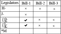 h,J,K,L,M,N and O are the only legislators eligible to vote on Bills 1,2 and 3, each of which will be passed if at least four legislators eligible vote in favor of it. each legislator must vote on all three bills; on abstentions are possible. The following is known : *H must vote against all three bills; each of the other legislators must vote in favor of at least one bill and against at lest one bill. *j must vote against Bills 1. *O Must vote against Bills 2 and 3. * L must the same way that K dose on all three bills.*N must vote the same way that O dose on all three bills. which of the following cannot be true ?