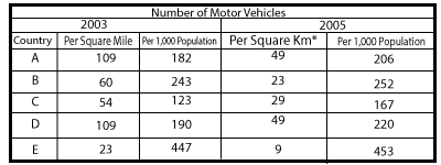 In 2005 Country d had approximately how many motor vehicles per square mile?
